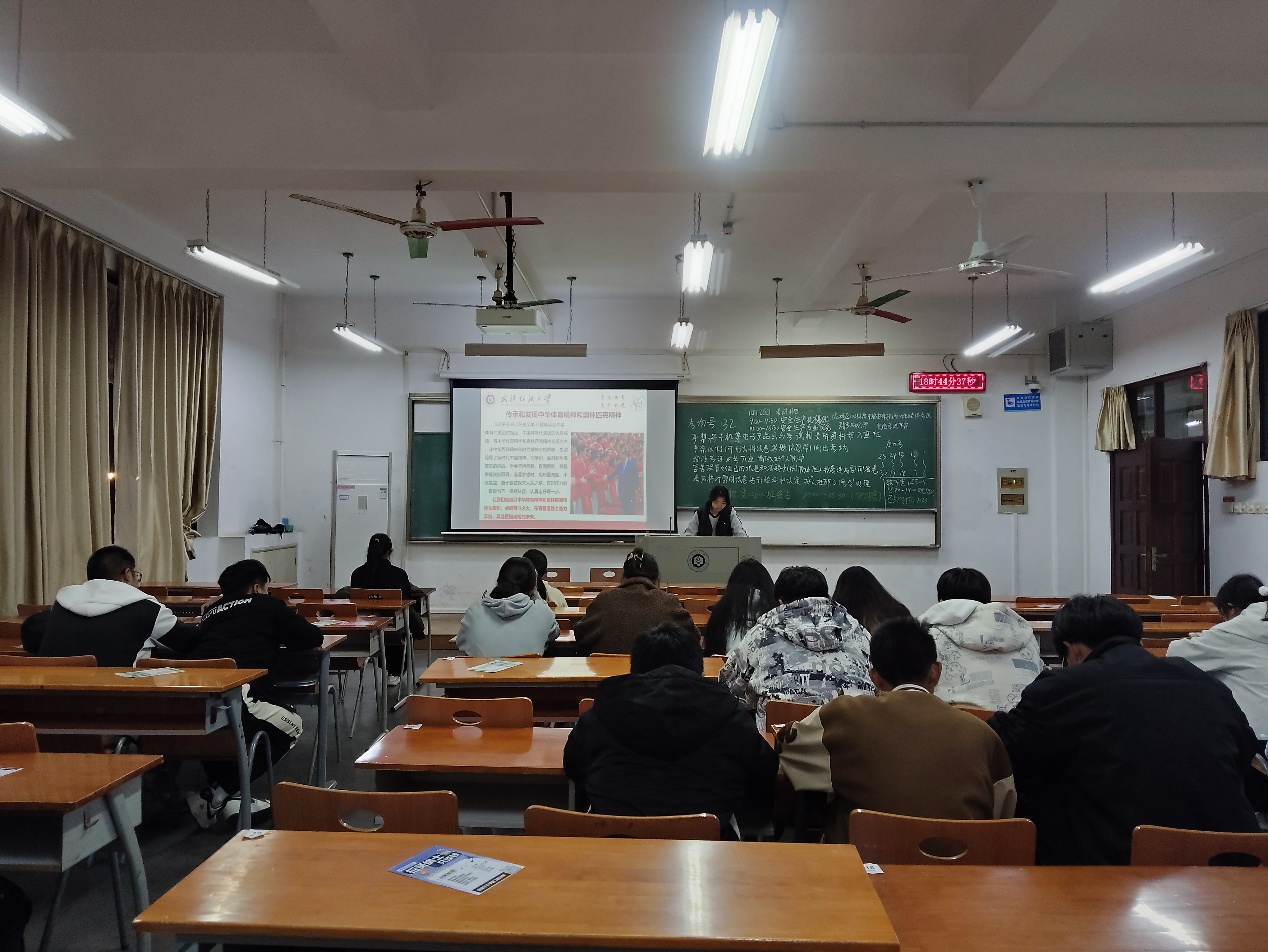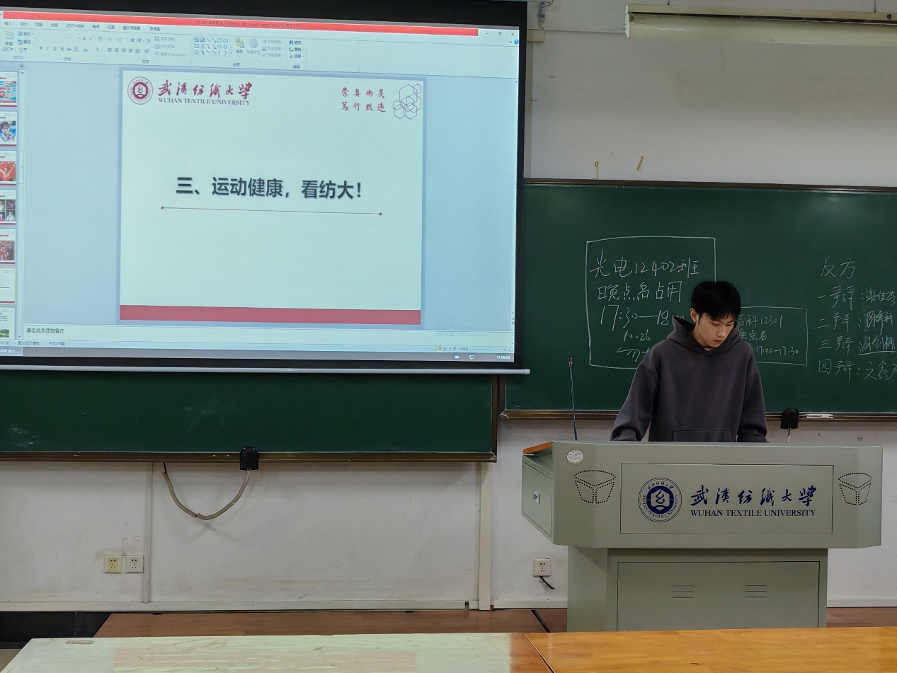 班长引出武汉纺织大学运动会,介绍举办时间、赛事项目与报名方式,指出其是校园体育文化重要部分。分享往届我院学子拼搏的精彩瞬间,鼓励同学参与,无论是运动员、志愿者还是观众,都是践行运动精神。各班讨论参与方式,同学积极发言,班主任肯定热情,鼓励享受运动、传承精神。
