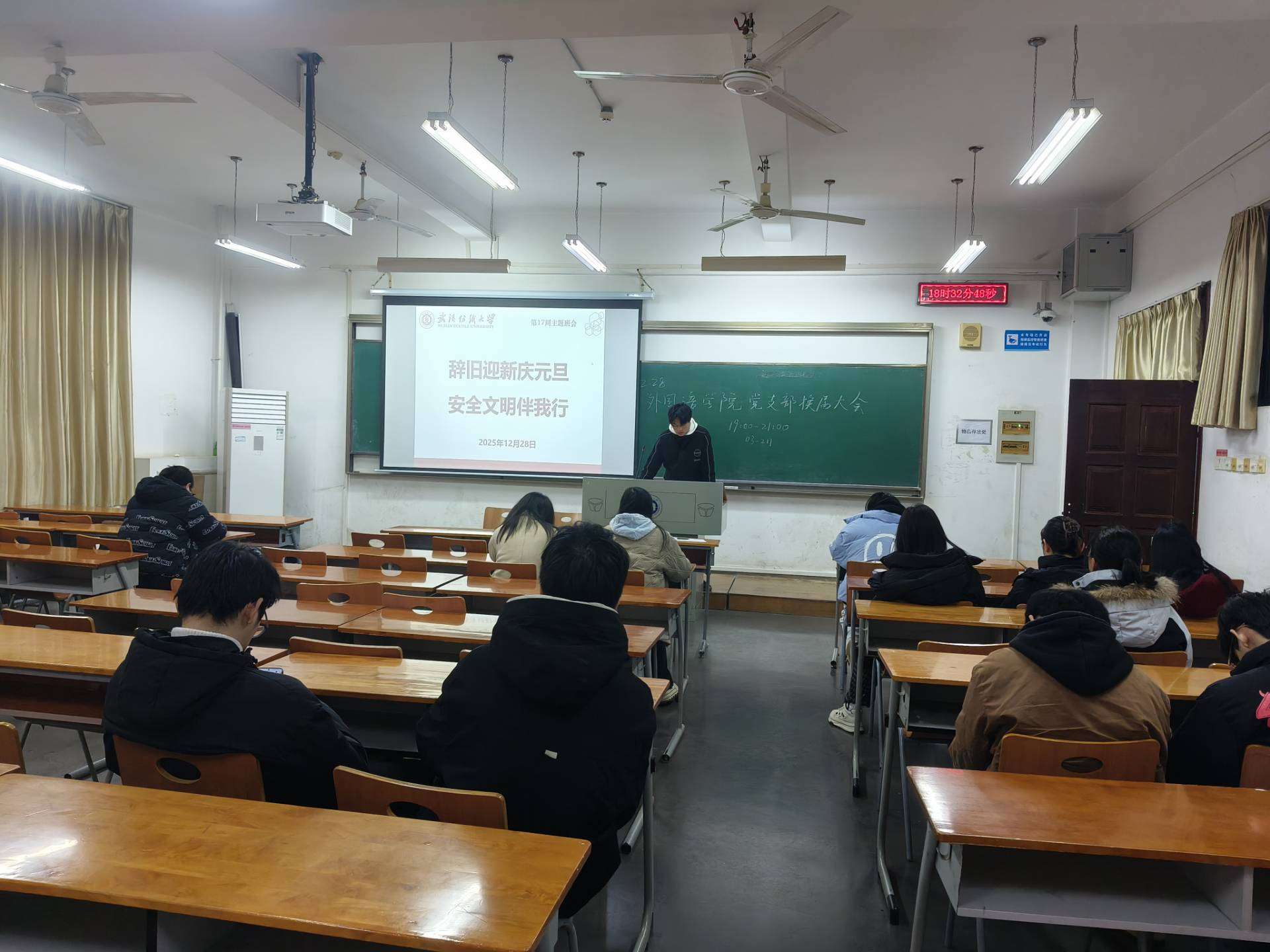 各班班长通过PPT展示元旦节放假通知的具体内容,明确了假期时间安排,并结合学院实际,对假期前后的教学衔接、学生离校返校管理提出要求。同时,针对元旦假期的交通安全、消防安全、人身财产安全等重点事项进行强调,提醒学生增强安全防范意识,合理规划假期行程。