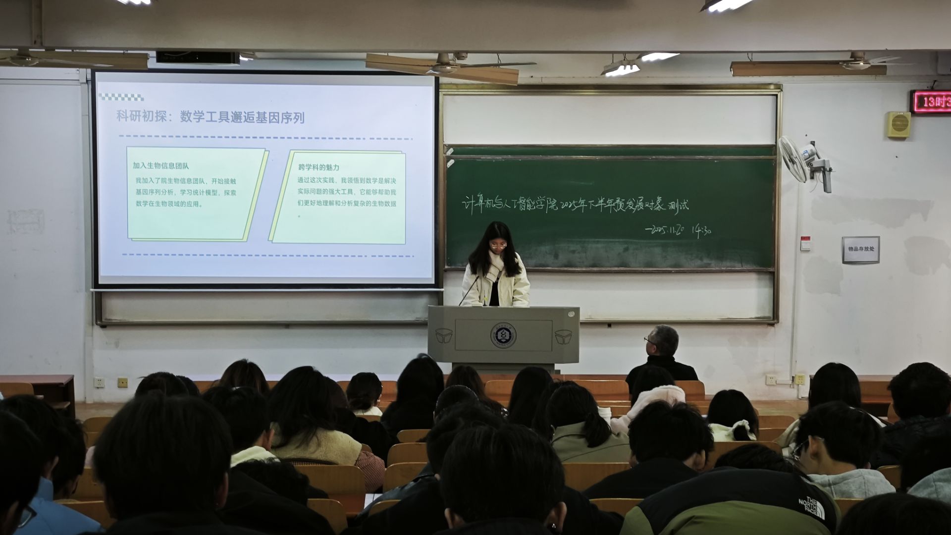 论坛现场,江健老师首先介绍了本次论坛的意义,鼓励同学们积极交流、汲取学习成长经验。随后,三位主讲同学结合自身经历展开分享:吴双玥同学以“数海扬帆,笃行致远——从专业到科研的成长之路”为题,分享了从数学逻辑探索到生物信息领域科研实践的进阶路径,详细拆解了核心课程学习、编程技能锤炼与子课题参与的方法,明确了未来发表学术论文、深耕医疗大数据领域的规划,展现了扎实进取的学术态度;方金玉同学围绕“以数践志,感恩前行——在励志中书写青春担当”,讲述了国家励志奖学金背后的奋斗故事,坦言奖学金是经济支持更是精神激励,她将持续筑牢学业根基、锤炼复合能力,以实际行动回馈学校与国家的关怀;胡钟锦同学聚焦“心有所向,追光而行”,分享了平衡学业、学生工作与学科竞赛的高效技巧,强调“钻研精神”与“氛围赋能”的重要性,鼓励同学们通过志愿服务与兴趣培养实现全面发展,保持对专业知识的热忱。