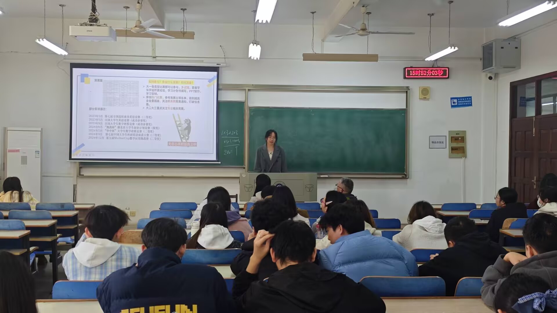 在三教409教室召开本科生论坛。本次活动邀请了苏宇,李奕洋,和张雅祺三位优秀本科生进行分享经验。副院长郑仟出席,江健老师主持、总结,2024级数学与应用数学专业的全体学生参加会议。
