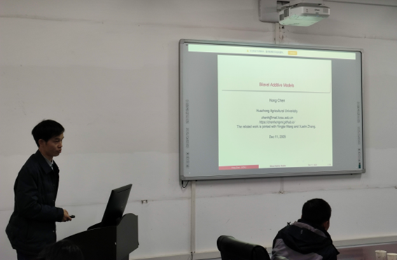 论坛报告环节内容扎实、亮点纷呈。首先,华中农业大学陈洪教授以《Bilevel Additive Models》为题作报告。针对传统可加模型过度依赖先验知识、损失函数设计缺乏自适应性、噪声特征干扰流形学习效果的核心痛点,陈洪教授创新性提出双层可加模型构建方案。该模型通过双层优化框架实现数据驱动的知识挖掘,相关理论分析与多组实验数据均验证其在函数逼近与变量选择性能上显著优于传统模型,为机器学习领域自适应建模提供了新范式。