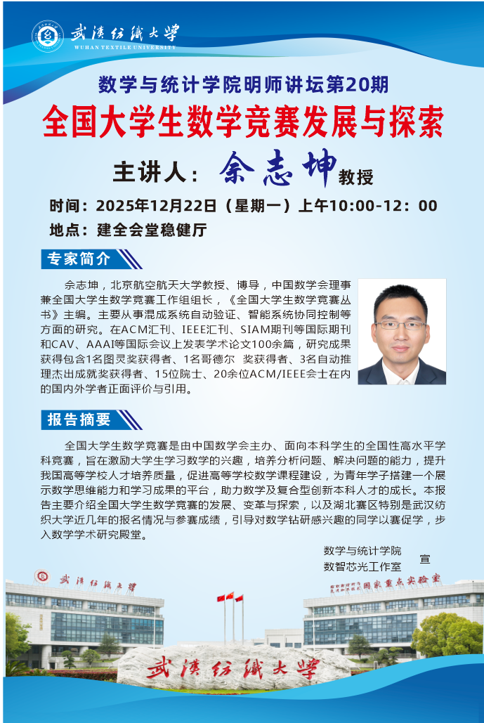 于12月22日上午,在健全会堂稳健厅举办了“全国大学生数学竞赛与探索”专题学术报告。本次讲座特邀北京航空航天大学教授、博士生导师、全国大学生数学竞赛工作组组长佘志坤担任主讲。学院党委副书记陈国鹏及师生代表参加了本次活动,现场座无虚席,气氛热烈。